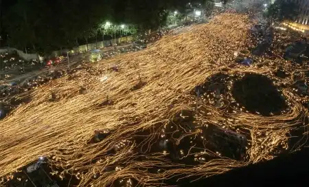 Protesters holding candles march during a rally demanding a full-scale renegotiation of the beef deal with the U.S. and the resignation of President Lee Myung-bak around the city hall in Seoul, South Korea on June 7, 2008. Hundreds of thousands of people fearing infection of mad cow disease participated in the protest. (REUTERS/Jo Yong-Hak)