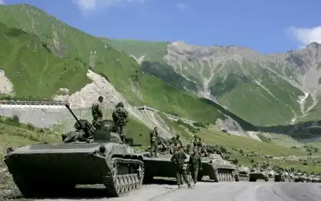 A convoy of Russian troops makes its way through the Caucasus Mountains toward the armed conflict between Georgian troops and separatist South Ossetian troops, in the South Ossetian village of Dzhaba on August 9, 2008. Georgian President Mikheil Saakashvili declared a "state of war" as his troops battled it out with Russian forces over the breakaway province of South Ossetia. (Dmitry Kostyukov/AFP)