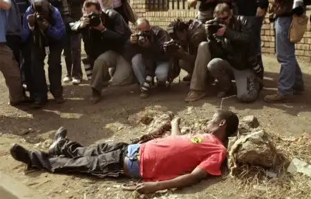 Photographers take pictures of an injured man during clashes believed to be linked to recent anti-foreigner violence in Reiger Park informal settlement in South Africa on May 20, 2008. South African police fired rubber bullets at hundreds of shantytown residents on Tuesday in a crackdown on violence against foreigners which ended up killing over 60 people and injuring hundreds more. (REUTERS/Siphiwe Sibeko)