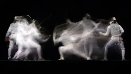 Giovanna Trillini of Italy and Nam Hyunhee of South Korea compete in the semifinals of the women's individual foil fencing event at the Fencing Hall on Day 3 of the Beijing 2008 Olympic Games on August 11, 2008 in Beijing, China. (Alexander Hassenstein/Bongarts/Getty Images)