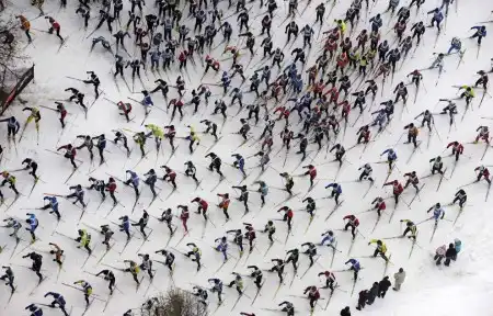 Thousands of sportsmen and women are seen on their way from Maloja to S-Chanf near St Moritz in south eastern Switzerland on March 9, 2008 as they participate in the annual Engadin skiing marathon. (AP Photo/Keystone/Alessandro Della Bella)
