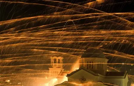 Rockets fly over bell tower of Ayios Marcos church during Greek Orthodox Easter celebrations on the eastern Aegean island of Chios in Greece late on April 26, 2008. Two rival parishes of Vrontados village fire thousands of rockets every Easter Saturday aiming at the opposing church's bell tower in a centuries-old tradition. (REUTERS/Yiorgos Karahalis)