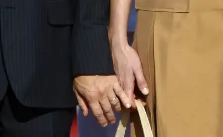 French President Nicolas Sarkozy gently touches the hand of his wife Carla Bruni-Sarkozy during a welcoming ceremony in Ben Gurion airport in Israel on June 22, 2008. (REUTERS/Yannis Behrakis)