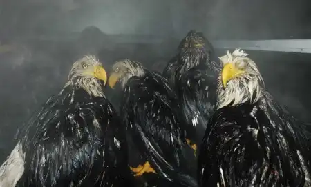 In this Jan. 11, 2008 photo, eagles await transfer to a warm U.S. Fish and Wildlife warehouse after being rescued from the cold in Kodiak, Alaska. They were among 50 eagles which dove into the back of an uncovered dump truck full of fish guts and became too wet to fly away. (AP Photo/Jay Barrett)