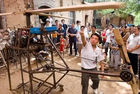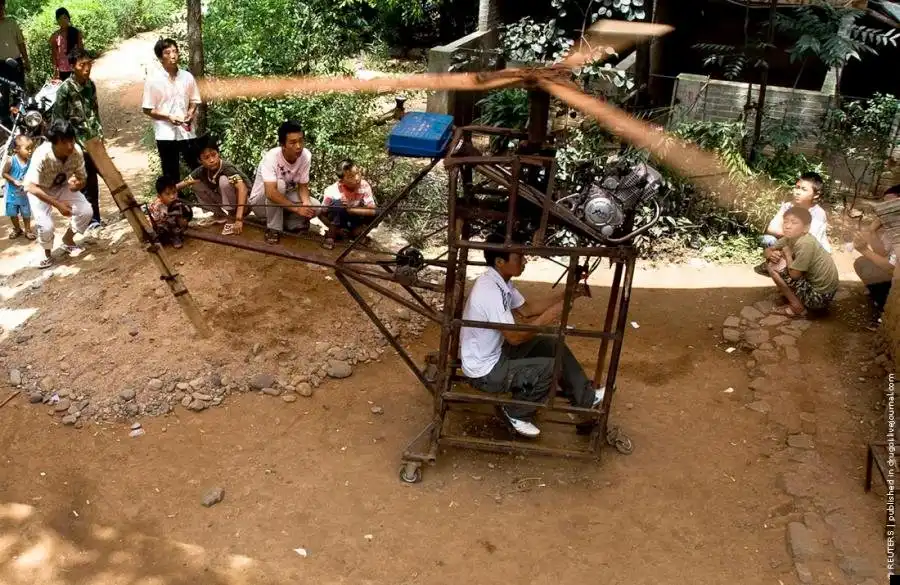 22-летний китайский крестьянин из подручных средств собрал вертолет собственной конструкции. Местная полиция уже запретила юноше отрываться от земли, так что пока неизвестно может ли летать эта железяка. К слову, аппарат приводится в действие двигателем от мотоцикла объемом 150 кубических сантиметров.