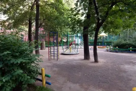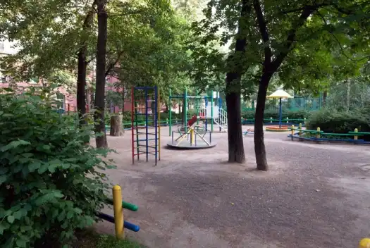 Чтобы хоть как-то скрасить жильцам дома малосимпатичное соседство двор превращён в небольшой парк. Очень много зелени, цветники, скамейки, детские площадки.