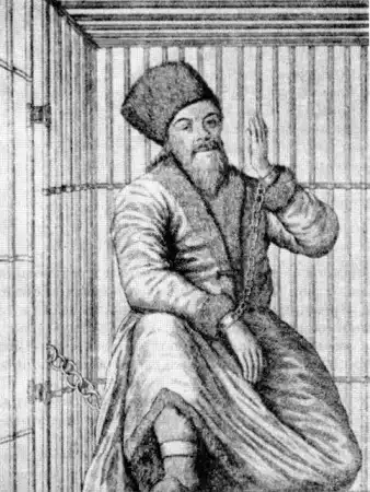 Пугачёв, заключённый в клетке. Гравюра 18 века.