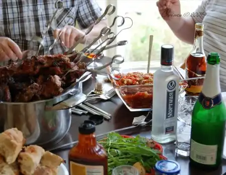 Шашлык, я думаю никто не сомневается, что это изобретение не принадлежит Кавказу. Просто в силу своих главных занятий- скотоводством для народов Закавказья он приобрёл черты национального блюда. Сколько существует человечество столько и существует способ запекания мяса на открытом огне, цельными тушами, частями, но всегда принцип оставался один — вертел, мясо, костер. И сейчас трудно сказать, кто из разумного человека додумался сунуть мясо в костер, думаю это произошло случайно и с этого момента началось рождение шашлыка. Правда патентов тогда не выдавали и мы наверное уже никогда не узнаем, кто первый попробовал запечённый кусок мяса)). Но само слово шашлык, можно постараться определить откуда оно пришло в русский язык. Существует одна теория и я придерживаюсь ее тоже, что произошло оно, а точнее придумано украинцами – запорожцами и перенесено в русский язык солдатами после Крымских походов. И является изменённой формой крымско–татарского слова «шиш»- что означает вертел и «шиш — лык « — еда на вертеле. Слово шампур, скорее произошло от слова шомпол от ружей, на который нанизывали мясо.