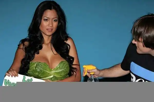 Известная филлипинская актриса и модель Алисия Майер в свою очередь поддержала PETA в их борьбе за овощеедение и отказ от мясного. Листики салата, правда, все время норовили упасть, но актриса мужественно выстояла положенное перед объективами.