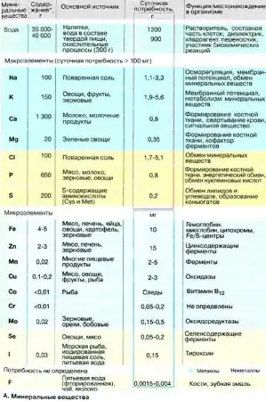 Значение многих минеральных материалов и количество их, необходимое для человека, далеко еще не изучены. Но в отношении некоторых из них уже проведено много исследований на животных и на человеке. Так, в целом известно, что соли кальция и фосфора являются первейшими составными деталями костной системы, фосфор входит в состав нервной и других тканей. В настоящее время уже известно, что соли кальция и магния имеют большое значение для безупречной работы сердечной мышцы и вообще целой мышечной системы. Соли металла железа входят в состав красящего материалы крови и способствуют переносу кислорода к тканям, а соли меди имеют большое значение для процессов кроветворения и т. д.