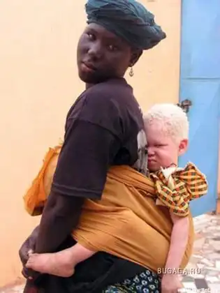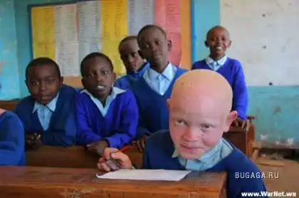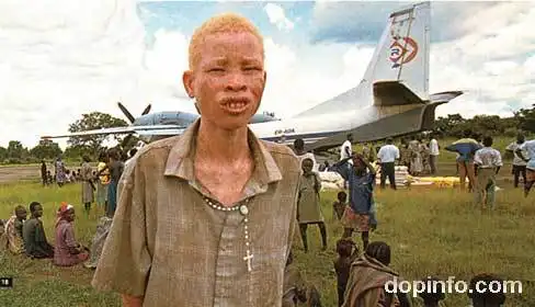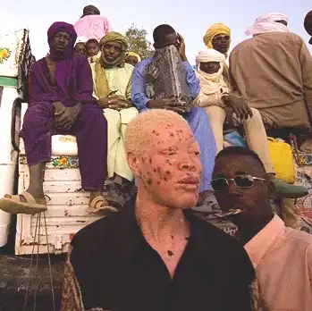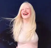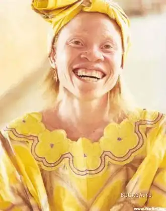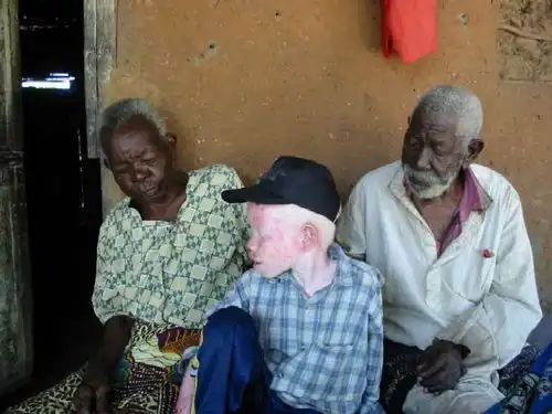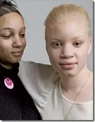 Люди-альбиносы имеют белую окраску кожи (что особенно бросается в глаза в группах, принадлежащих не к европеоидной расе); волосы у них белые (или они блондины), а глаза красные, потому что отражённый свет проходит через красные кровяные сосуды в их глазу.