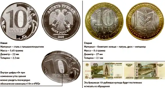 Новые монеты – монометаллические. Это сталь с латунным гальванопокрытием. Решение заменить десятирублевые банкноты монетами было принято из соображений экономии. Нормативный срок службы монеты – около 10 лет. Бумажная десятирублевка, самая мелкая на сегодня банкнота, находится в обращении всего несколько месяцев.