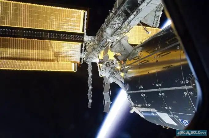 Астронавт шаттла «Дискавери» Джон «Дэнни» Оливас работает в ярком свете, отражаемом зеркальной поверхностью Международной космической станции и золотистыми панелями солнечных батарей 1 сентября. На заднем фоне виден яркий горизонт Земли. Во время стыковки шаттла «Дискавери», астронавты заменили на станции баки с охлаждающей жидкостью.