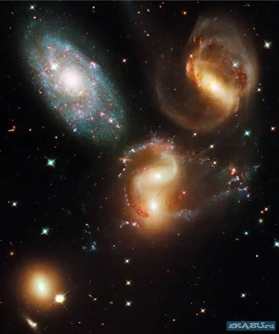 Скопление галактик, известное как Квинтет Стефана, сияет на этом снимке телескопа Хаббл, опубликованном 9 сентября. Четыре галактики задействованы в одном «гравитационном танце»; может показаться, что пятая галактика (вверху слева) находится на одной линии с ними, однако это не так – на самом деле она намного ближе к нам.