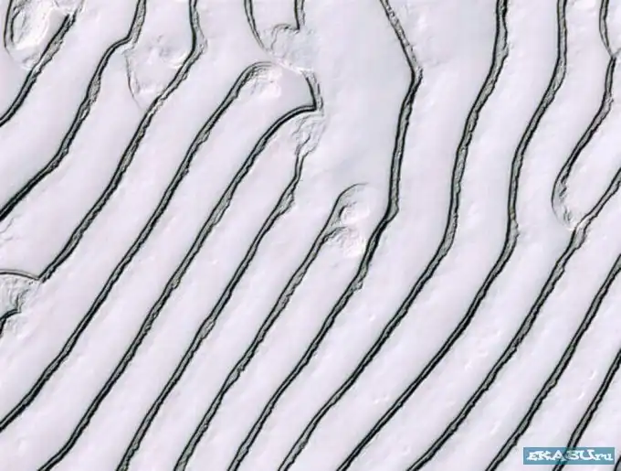 На этом снимке с высоким разрешением, сделанном автоматической межпланетной станцией НАСА в апреле и опубликованном в сентябре, изображен пилообразный узор на сухом марсианском льду.