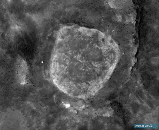 На этом снимке, сделанном с космического аппарата НАСА «Mars Reconnaissance Orbiter», изображено светлое пятно плато на Марсе, известное как «Основная база». Слева можно увидеть яркую белую точку – это ровер НАСА «Spirit» в позиции 9 часов.