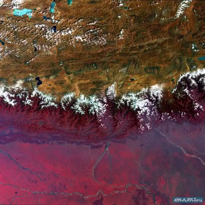 Этот снимок, сделанный спутником «Envisat» Европейского космического агентства, демонстрирует разнообразие ландшафта, высоты и климата Азии. Покрытые снегом Гималаи отмечают границу между вершинами Тибетского плато в Центральной Азии (наверху) и равнинами Непала, Бутана и Индии на Индийском субконтиненте (внизу). На этом снимке в искаженном свете зеленая растительность кажется ярко-красной.