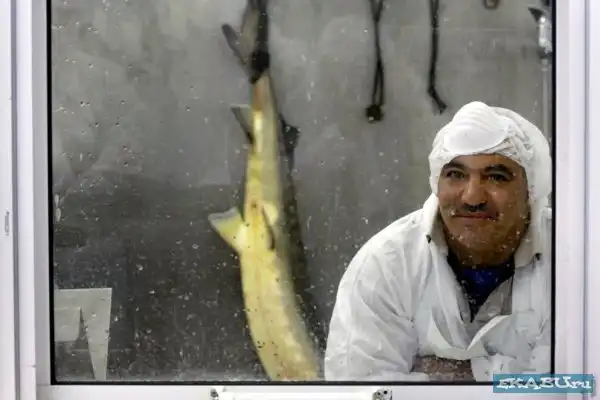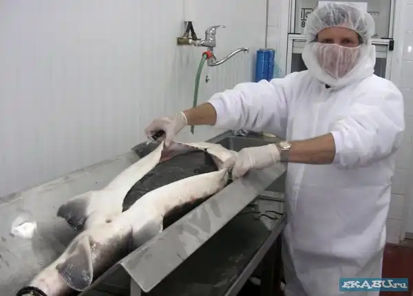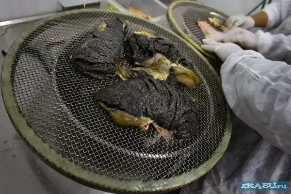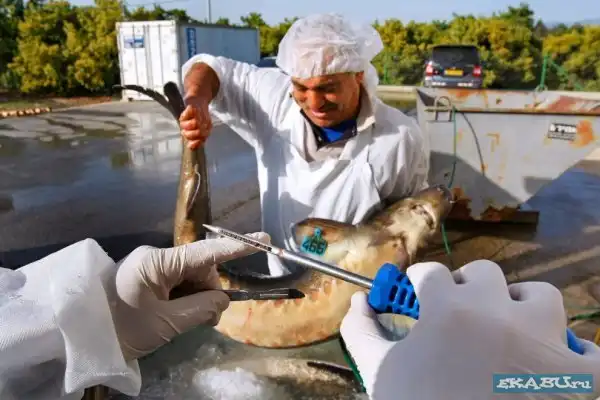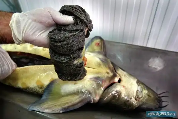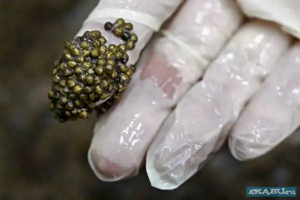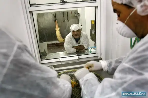 Рыбья ферма, где выращивают осетров, из которых и добывают икру. Затем продают в Японию, Европу, Америку по 5 тысяч баксов за кило. Любителям только покушать, а не видеть, как эта еда получается - смотреть не стоит.