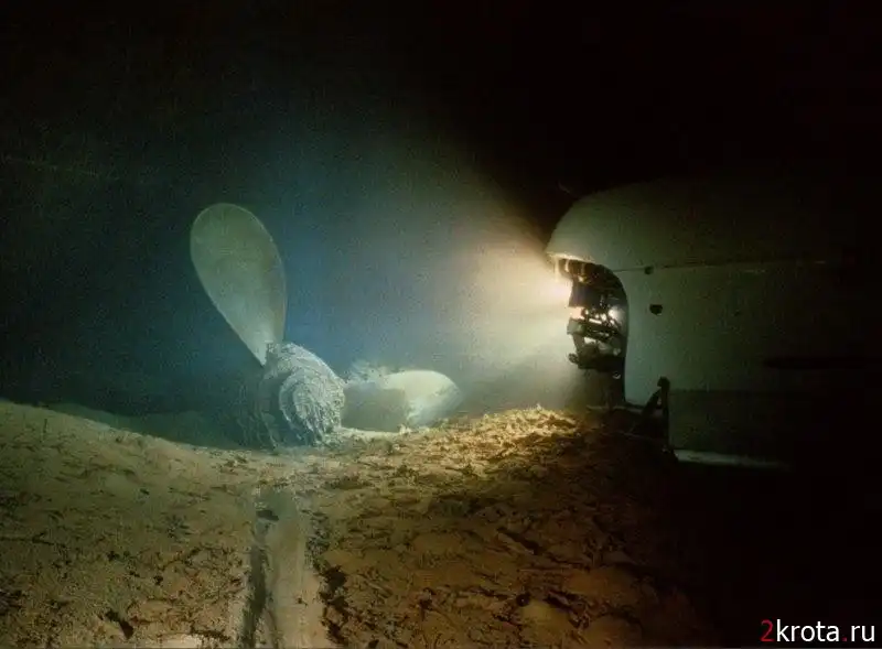 4) В ранние утренние часы 1 сентября 1985 океанограф Роберт Баллард и фотограф Эмори Кристоф обнаружили и сфотографировали останки Титаника. Криштоф и его команда использовали подводный поисковый аппарат и буксируемые салазки с фотокамерой, для того, чтобы сделать более 20 тысячи кадров, в числе которых был и этот снимок, на котором можно увидеть правый винт затонувшего океанского лайнера