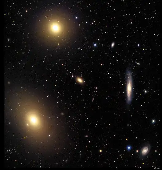 Скопление галактик Virgo- самое близкое скопление галактик к нашей Галактике - Млечному пути. Virgo так близко, что охватывает больше чем 5 градусов на небе - в 10 раз больший угол, чем занимает полная Луна. Это скопление содержит более чем 100 галактик многих типов - включая спираль, шаровые, и нерегулярные галактики. Virgo настолько массивна, что оказывает значительное гравитационное влияние на нашу Глактику. Скопление содержит не только галактики, заполненные звездами, но также и разогретый газ.