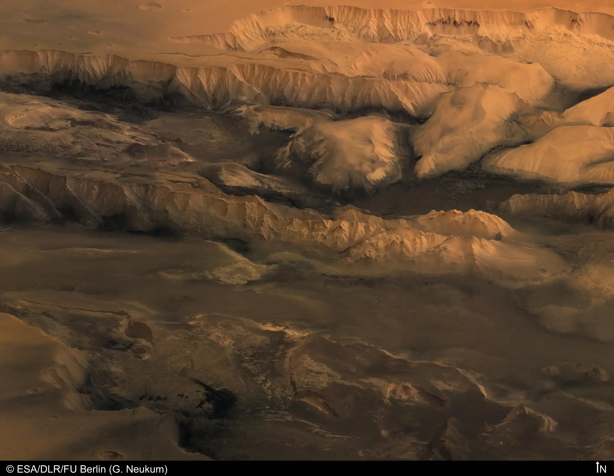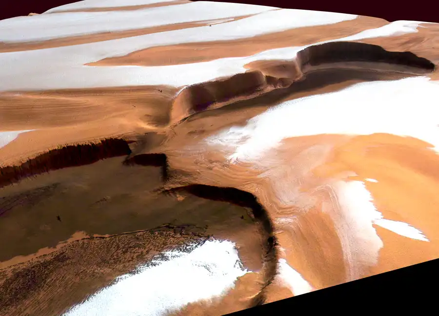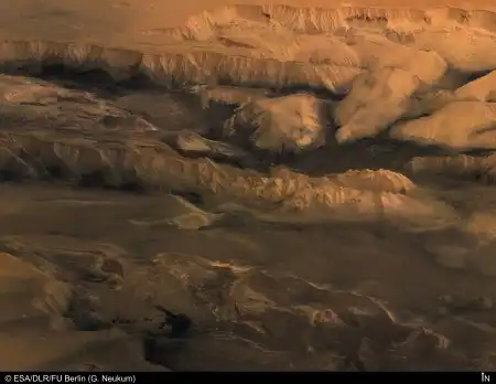 Полярная область МарсаУ северного полюса Марса на 2 км в высоту тянутся вертикальные утесы. Красные области на снимке марсианской северной полярной шапки - это скалисто-песчаные участки поверхности, белые - участки, покрытые льдом. Состав темных областей пока неизвестен, но предполагается, что он включает в себя вулканический пепел. Утесы граничат с вулканической кальдерой (кальдера - обширная овальная или круглая котловина вулканического происхождения - прим. пер.). Хотя склоны марсианских утесов очень крутые, в нашей солнечной системе встречаются обрывы и покруче: каньон Колка на Земле имеет глубину 3,4 км, скала Верона Рупес на спутнике Урана Миранде - глубину 20 км. Снимок получен с помощью стереокамеры с высоким разрешением и обработан цифровым методом для получения перспективного вида. Стереокамера установлена на борту автоматического космического аппарата Марс Экспресс, запущенного Европейским Космическим Агентством, и находится в настоящее время на орбите вокруг Марса.