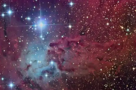 Галактика СомбрероВзрыв сверхновой звезды в соседней галактикеТуманность Лисий МехВ туманности, окружающей яркую звезду S Mon, много темной пыли и светящегося газа. Возникновение туманности с такой странной формой объясняется взаимодействием мелкой межзвездной пыли с интенсивным излучением и горячим газом, истекающим из молодых звезд. Область, расположенная на рисунке ниже самой яркой звезды - S Mon - за ее цвет и структуру получила называние туманность Лисий Мех. Голубое свечение вокруг S Mon возникает в результате отражения света яркой звезды окружающей пылью. Более размытое красное свечение - это излучение, возникающее при ионизации водорода звездным светом. Розовые области - результат действия обоих процессов. S Mon является членом молодого рассеянного звездного скопления NGC 2264, расположенного примерно в 2500 световых годах от нас в созвездии Единорог, к северу от туманности Конус.