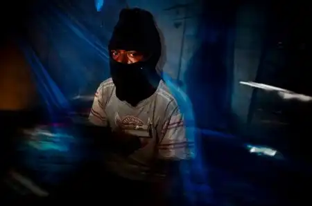 32. Член гангстерской группировки «Раскол» со сделанным вручную пистолетом. Снимок сделан в бедном поселении в 12 км от Порт Морсебай. (Brent Stirton/Getty Images)