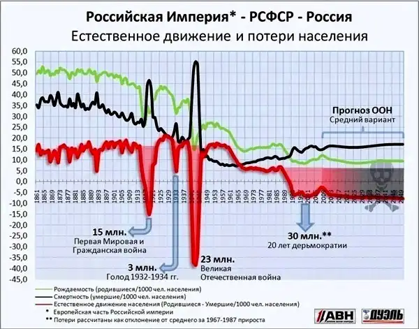 Министр регионального развития России Владимир Яковлев считает, что миграционно-демографическая ситуация в стране по уровню остроты вышла на первый план. "В стране скоро некому будет работать. До 60% россиян – это старики, дети и инвалиды. Из 20 млн мужчин трудоспособного возраста примерно 1 млн отбывает заключение за различные преступления, 4 млн служат в системах МВД, МЧС и ФСБ. Еще 4 млн – хронические алкоголики, а 1 млн – наркоманы" - заявил Яковлев. Министр добавил, что мужская смертность в России в 4 раза превышает женскую. "Сейчас потери здоровых мужчин сходны с потерями СССР в годы Великой Отечественной войны", - считает Яковлев.