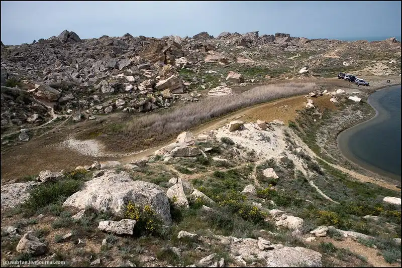 Среди этих обломков находим небольшое озеро. Вокруг тысячи следов верблюдов и лошадей, это водопой в километре от моря.