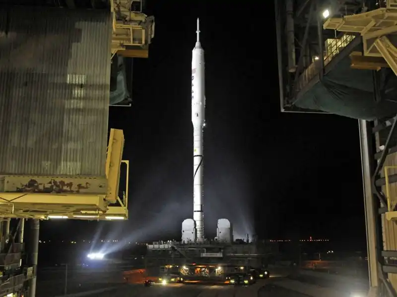 7. Новый тестируемый аппарат Ares 1-X покидает корпус по сбору шаттлов утром 20 октября и направляется на стартовую площадку Launch Pad 39B в Космическом центре Кеннеди во Флориде для своего первого запуска. Ракета Ares разрабатывается для отправки астронавтов в космос после того, как космический флот шаттлов уйдет в отставку. (Bruce Weaver / AFP - Getty Images)