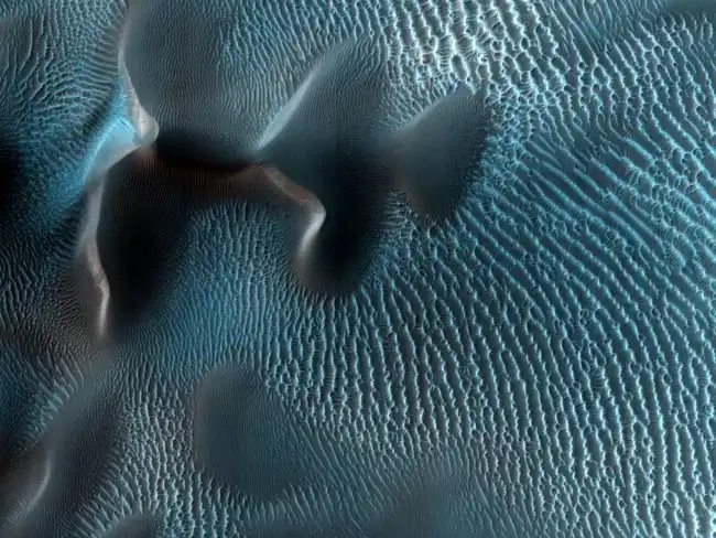8. На этом снимке, сделанном станцией «Mars Reconnaissance Orbiter» и опубликованном 7 октября, видно, как марсианские ветры придают песку причудливую форму. Снимок представлен не в красных, а в голубых тонах, чтобы можно было различить малейшую разницу в композиции поверхности. (University of Arizona via NASA/JPL)