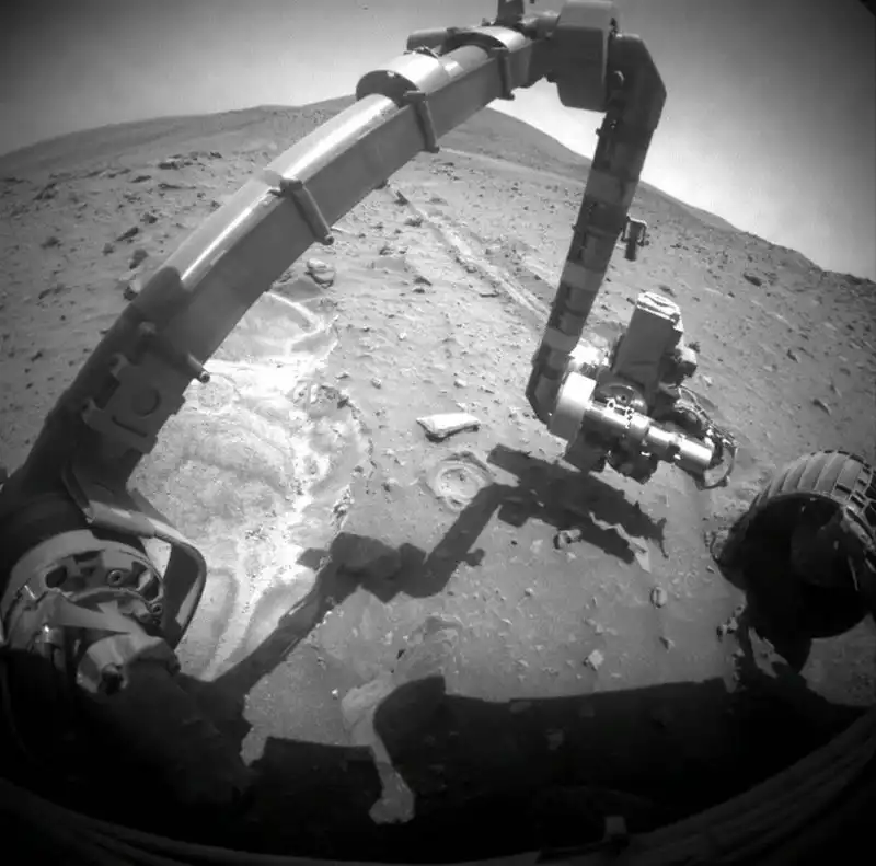 18. На этом снимке, сделанном 11 октября, ровер NASA «Spirit» вытягивает свою механическую «руку» для получения пробы с поверхности Марса. Яркая почва слева на фотографии представляет собой вязкое вещество, в котором ровер «увяз» на последние полгода. (Caltech / NASA via JPL)