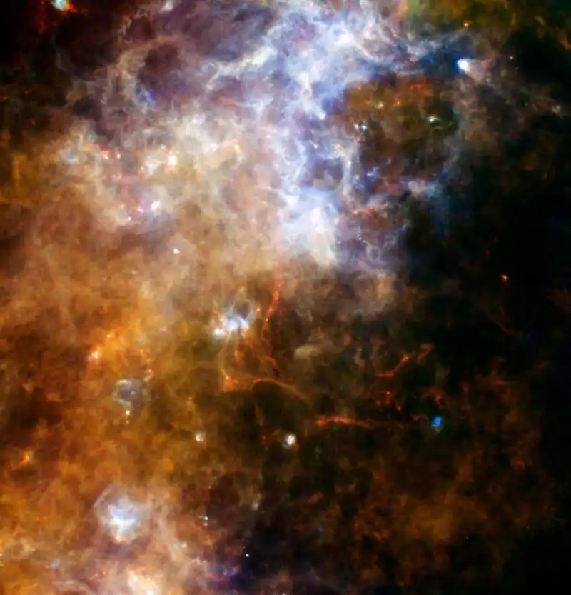 16. На этом инфракрасном снимке с зонда «Herschel» Европейского космического агентства, опубликованном 2 октября, можно видеть облака пыли и газа в нашей галактике Млечный Путь. Ученые говорят, что облака обволакивают группы новорожденных звезд. На снимке представлена композиция света, полученная с помощью двух групп инструментов на зонде «Herschel» - матричного фотоприемника и спектрометра и ресивера спектральных и фотометрических изображений. (ESA/NASA/JPL-Caltech via AP)