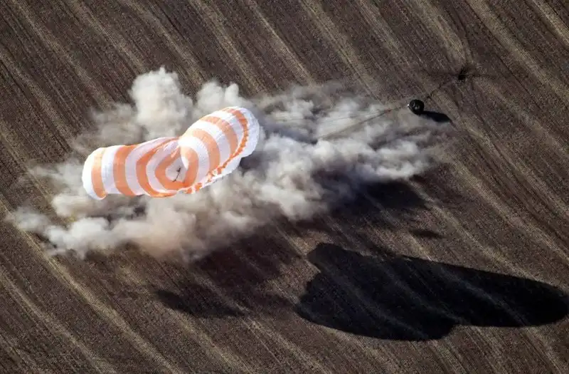 13. Русский «Союз» поднимает в воздух столпы пыли, приземляясь в степи Казахстана 11 октября. В этой капсуле русский космонавт Геннадий Падалка, астронавт NASA Майкл Барратт и канадский миллионер Гай Лалиберте вернулись на Землю с Международной космической станции. (Yuri Kochetkov / EPA)