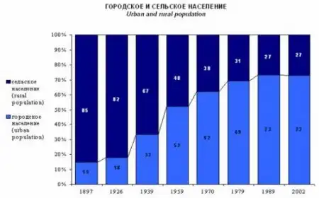 Всё изменилось с появлением тракторов. Один человек на тракторе мог прокормить сотни людей. Эти сотни людей заняты тем, что делают трактора, но не только. Количество людей, занятых производством машин, и всего, что с этим связано, характеризует техническую вооруженность общества. Опосредованно это выражается в отношении городского населения к сельскому. Соотношение городского и сельского населения выражает степень урбанизации страны.Результаты урбанизации России внушительны. В 1897 году в России было только 16 городов с численностью более 50 тысяч человек, и только 7 из них были большими. В 1989 г. в России был 1001 город (без городов Южного Сахалина и Калининградской области). Из них 632 образовались в годы советской власти. В 170 городах проживало 70% населения.
