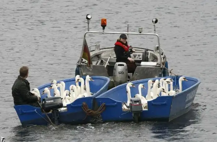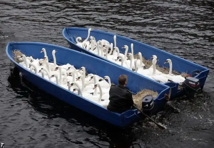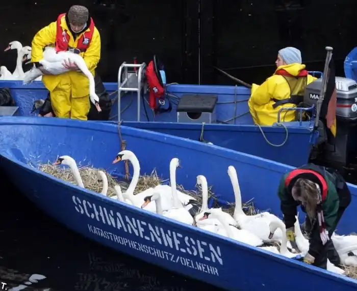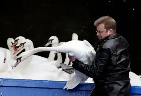 Каждую осень работники парков в Гамбурге перевозят лебедей в специальные постройки, в которых те живут до наступления весны.