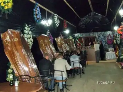 Это местное изобретение — ресторан «Вечность» в Трускавце, Украина. Формой он напоминает большой гроб, внутри вся обстановка также выдержана в кладбищенском стиле, меню включает блюда, такие как салатики «девятый день» и «сороковой день», а также горячее блюдо «встретимся в раю». crazy На столах и на стенах горят свечи, повсюду расставлены гробы и прочие похоронные атрибуты.