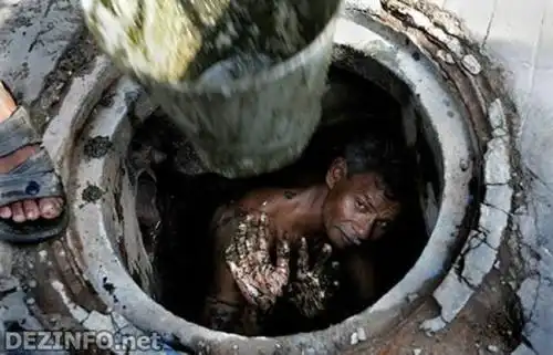 Чистильщик канализации…Именно эту почётную должность занимает Рамеш Саху в Калькутте.Обычно он сидит в одних трусах в двухметровой яме, вооруженный мотыгой и металлическим штырем. Двое помощников подают ему ведро, в которое чистильщик собирает дерьмо…За эту работу 27-летний отец троих детей получает 100 долларов в месяц.