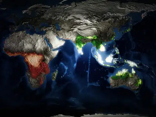 Сильное поглощение показано зелено-белым цветом, и наиболее сильно в тропиках. Красно-белый цвет показывает области, выпускающие CO 2 в атмосферу, наиболее сильно в Центральной Африке, где солнце не светит.