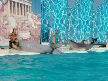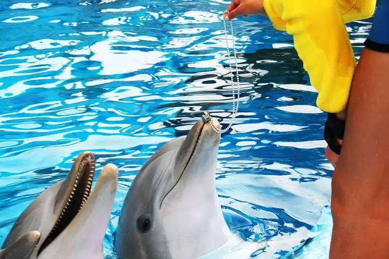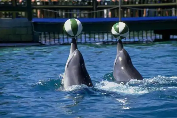 Цирковые выступления дельфинов демонстрируются во многих океанариумах и дельфинариумах, вызывая большой восторг публики. Дельфины прыгают в заклеенные бумагой или горящие обручи, играют в футбол, передвигаются на хвосте, катают на спине всадника, «поют» перед микрофоном, звонят в колокол и т. д.