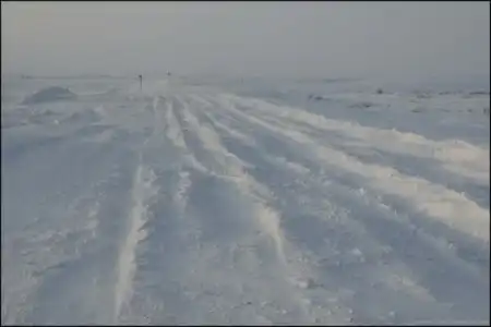 19) Снег топчут тракторами, поливают кипятком и потом ровняют такими чугунными чушками и ставят вешки. Получается настоящая широченная ледяная дорога, хотя и волнистая местами. С каждым снегопадом она становится всё лучше, и отдельные психи прорываются по ней аж до мая (на 6х6 КАМАЗах, конечно).