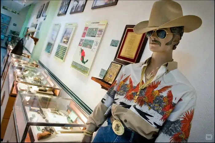 Все в той же комнате о нарко-культуре: манекен члена наркомафии стоит у стеклянной витрины с изъятым у наркодельцов и баронов оружием. (Sarah L. Voisin-Washington Post)