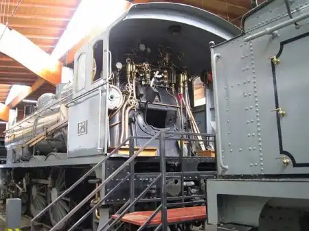 Паровоз 232 U 1. Виден заборчик, не позволяющий подойти близко. Раз в полчаса эти двухметровые колёса приходят в движение и несколько минут можно наблюдать имитацию их работы.