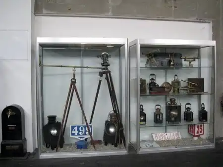 Прежде, чем попасть к локомотивам, мы проходим через относительно небольшое помещение, где расположены витрины с железнодорожными устройствами и артефактами.