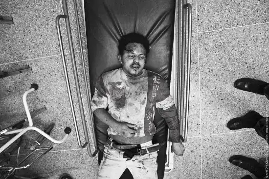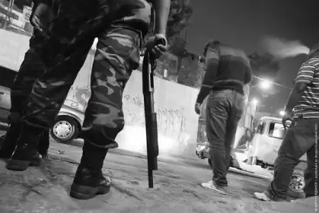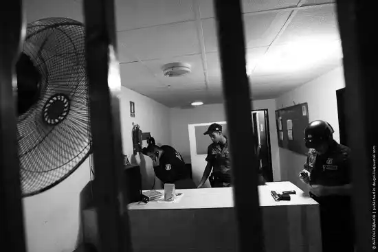 Айрон Бланко (справа), старший инспектор военизированной полиции штата Миранда, служит закону уже 13 лет. Новая социальная роль полиции — она не должна убивать людей в баррио без суда, как раньше. Чтобы выжить и прокормить семьи, многие полицейские бесчинствовали, убивая каждого вооруженного и отбирая потом у него все ценное, но при этом рискуя быть убитыми бандитами. Инспектор верен «новой линии» Уго Чавеса, провозгласившего перестройку полиции из сугубо репрессивного органа в структуру, помогающую осуществлять социальную функцию. «Многие люди считали нас убийцами. Теперь мы должны изменить этот стереотип», — говорит инспектор, осматривая отобранный у кого-то на улице пистолет.