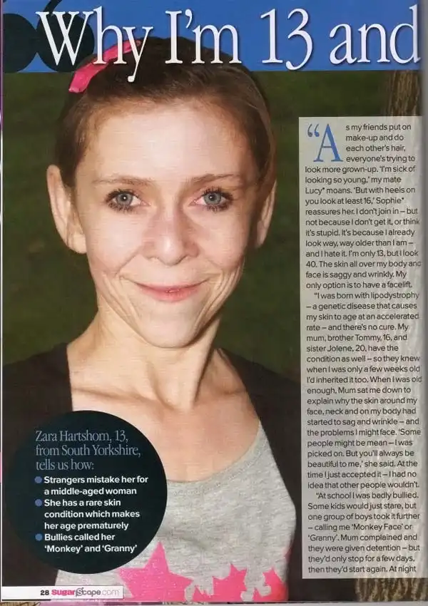 как ее щеки заливаются румянцем, а глаза наполняются слезами. «Если ты ребенок, то мне 21 год, — издевается над ней водитель. — Обманывай кого-нибудь другого, дорогуша».Низко опустив голову и сгорая от стыда, Зара поворачивается и выходит из автобуса. Она возвращается домой, мечтая о том, чтобы никто из знакомых не был свидетелем ее позора.«Это настолько оскорбительно, — говорит девочка. — Но так происходит все время. Я не могу получить детский билет на автобус или скидку на поход в кинотеатр. Когда люди видят меня в школьной форме, они думают, что я вырядилась так ради маскарада. В такие минуты я мечтаю провалиться сквозь землю, и желание это появляется очень часто».Из-за морщин на лице, мешков под глазами и тяжелых век Зару принимают за взрослую женщину, но на самом деле она совсем еще юная девушка. Когда она возвращается домой в слезах, ее мать, 40-летняя Трейси Хартшорн, ощущает боль дочери, как никто другой. Они обе страдают от одного и того же генетического заболевания, по вине которого выглядят намного старше своего возраста.Болезнь, которая называется липодистрофия, поражает подкожную жировую клетчатку и сопровождается ускоренным разрастанием наружных слоев кожи. Способов эффективного лечения не существует, так что Заре и Трейси остается только смириться с тем, что они выглядят на несколько десятилетий старше своих лет.