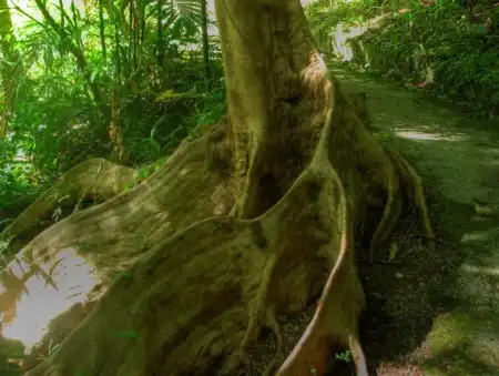 Первый маршрут пролегал вглубь острова, в пещеру Харрисона, овраг Велчман Холл и ботанический сад Flower Forest. Все три достопримечательности расположены рядышком, и осмотреть их можно за один день. Пещера, к сожалению, оказалась закрыта на реставрацию, однако остальное было открыто. Сперва прогулялся пешочком (километра два) до Цветочного леса, где помимо оригинальной карибской растительности собраны многие другие растения со всего тропического мира, от Африки до Австралии. Сад разбит прямо в джунглях и от окружающего леса разве что дорожками отличается.