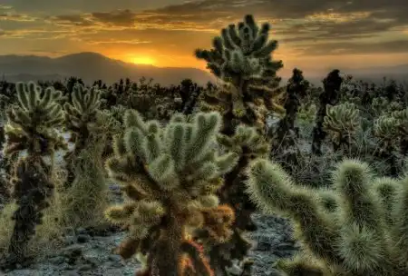 Опунция Биджелоу, наверное, один из самых удивительных видов рода Опунция семейства Кактусовых. Фотография, представленная выше сделана в Калифорнийском национальном парке Joshua–Tree. На фотографии весь пустынный ландшафт до горизонта покрыт удивительными пушистыми кактусами, высотой до двух метров. В лучах заходящего солнца пейзаж выглядит фантастически. У находящегося здесь человека складывается впечатление, что он в составе космической экспедиции высадился на другую планету, покрытую неизвестными формами жизни.