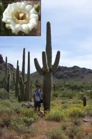 Карнегия гигантская (Сагуаро) ещё одно удивительное растение семейства Кактусовых. Самой удивительной особенностью этого кактуса являются его исполинские размеры. Высота отдельных растений составляет около 14 метров, а диаметр более 3 метров! При этом возраст отдельных кактусов достигает 150 лет.