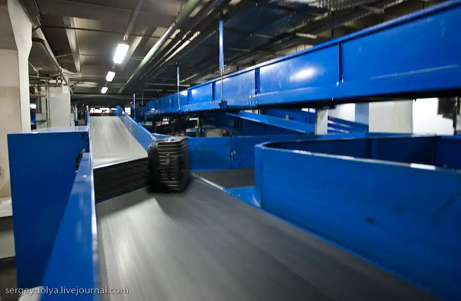 Чемоданы на большой скорости пролетают через еще один сканер. Здесь определяется, на какой рейс зарегистрирован чемодан и, в зависимости от этого, отправляется на левый или правый сортировщик, также называемый "кругом". Если "круг" правый, то чемодан уезжает наверх: